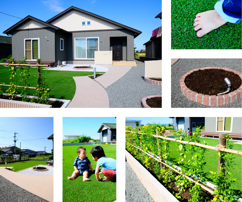 リビングの窓からは外の様子が伺え、見晴らしの良いガーデンで子供たちが遊んでいても安心。これから花壇に花を植えたり、シンボルツリーとなる樹木を植えたりと、家族で楽しみにしている庭づくりの計画もあるようです。色褪せない芝とともに、華やかに彩られてゆく庭の完成が楽しみです。