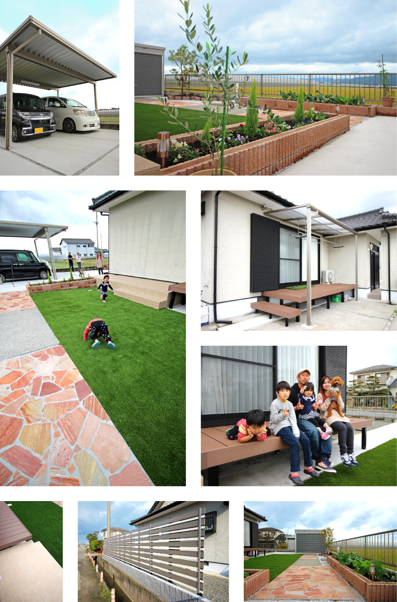 工事前の赤星様邸は、田畑との境界も何も無く、玄関前に車を停めるコンクリートが打たれただけのまっ平らなお庭。そこで、まずは敷地を区切る境界塀を設けました。道路側に生い茂っていた生垣も撤去して、すっきりとした人工木の目隠しフェンスにチェンジ。玄関前のコンクリートは、更に敷地いっぱいに広げて充分すぎるほどの駐車スペースを確保し、奥には2台分のカーポートを設置しました。風当たりが強い土地柄のため折半屋根のカーポートをご提案しましたが、真夏の強い日差しも遮ってくれるので、こどもたちの遊び場にぴったりです。リビング前のお庭には人工芝を惜しみなく張り、物置から駐車場へと続く自然石や洗い出しのアプローチが彩りを添えます。「物置から眺めるこのアプローチがとても気に入っています」と、ご満悦のご主人。要所に設けた花壇や菜園スペースに使った化粧ブロックは、以前自分たちで塀を造ろうと購入していたもの。「有効活用できて良かったです」と奥様も嬉しそう。そんな奥様のお気に入りは人工木のデッキとタイルテラス。タイルテラスは弊社がご提案したものでしたが、デッキからカーポートへ繋がる動線として、とても使い勝手が良いそうです。奥様が熱望された玄関脇のデッキとテラス屋根も、お洗濯物を干すスペースとして大活躍!必要なものだけを取り入れて完成した理想のお庭は、明るい色で溢れ、それは笑顔の絶えない赤星様ご家族そのものでした。