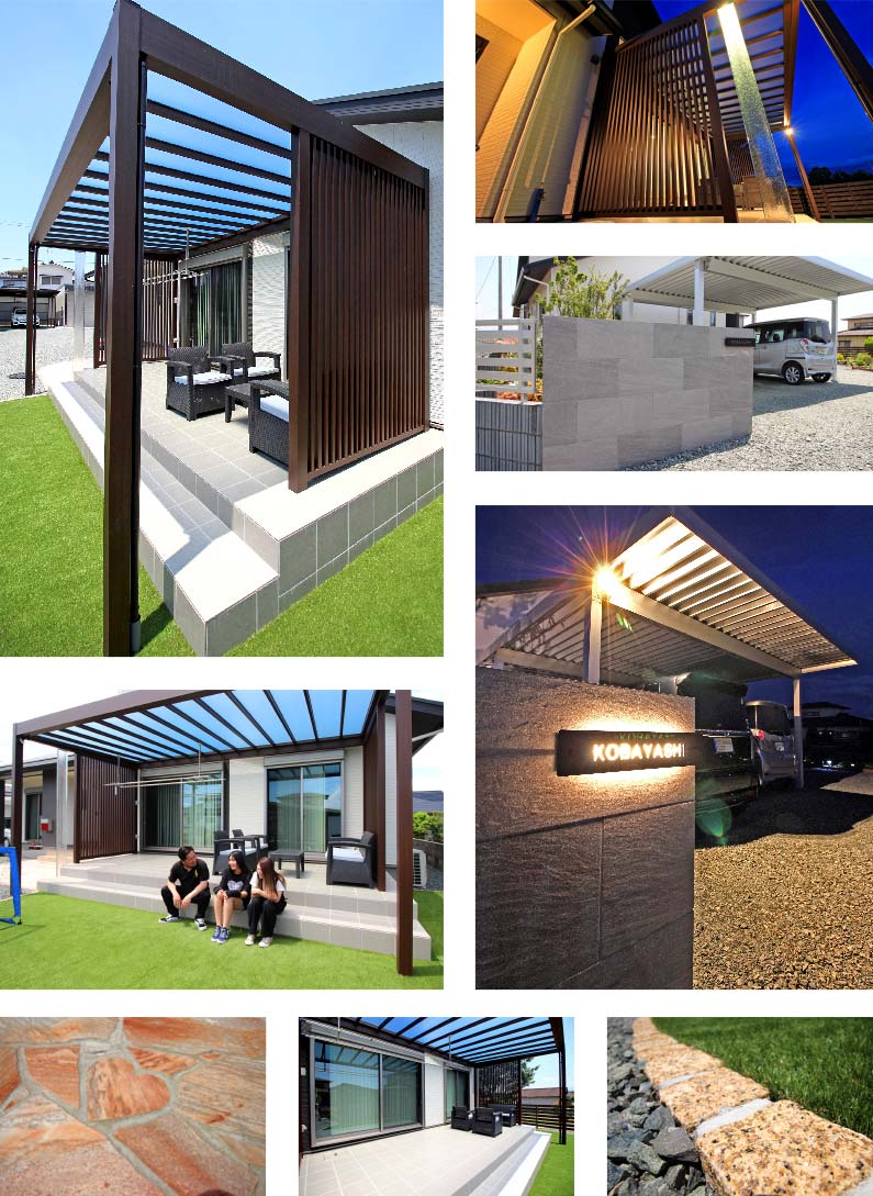 工事後はお庭で過ごす時間が増えたという小林様。「以前は家の中でホットプレートでの焼肉をしょっちゅうやっていましたが、家を建て替えてからは煙が気になって禁止していました。庭が綺麗になってからは外でバーベキューを楽しめるようになり、もう何回肉を焼いたか分かりません(笑)。週末には友達や親せきが自然と集まるようになりました」と話すご主人は、テラスのステップに腰掛けて、人工芝を眺めたり広いテラス屋根を見上げたり…なんとも言えない充足感を日々感じているそうです。奥様も「洗濯物が干せる、雨を避けられる、広さが欲しい。そんな提案を快く受けて頂いてこんな素敵な空間ができました。部屋続きで外に出られて、多少の雨は気にならないのですごく良いです」と、笑顔を覗かせます。ガーデンテラスの先に広がる人工芝は弊社からのご提案でしたが、休日には小さなサッカーコートとなってご主人と娘さんが駆け回ったり、星の綺麗な夜はお母様と娘さんが芝の上に寝転んで空を眺めたり…ご家族の生活に欠かせない場所となっていました。「プランに取り入れて良かったね」と、顔を見合わせて笑うご家族。「表札をお願いしましたが、せっかくなので古い門柱にタイルを貼ってかっこよくリニューアルしました。植栽は母のこだわりで、母が育てた樹木を取り入れながらとても良い感じに仕上げて頂きました」。テラスと玄関を繋ぐ自然石貼りのアプローチやえんぴつ型の水栓。所々にご家族のこだわりが光り、遊び心が溢れています。生まれ変わったお庭ではご家族の笑い声が絶えることはなく、照りつける太陽に負けないキラキラの笑顔が、眩しく弾けていました。
