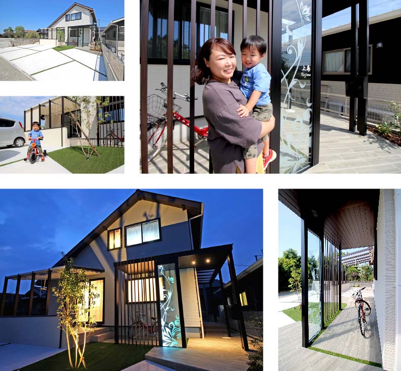 上島様の敷地は、左右の勾配に大きな違いがあります。今回は、そんな敷地の特徴を上手に活かしたデザインを行いました。「まず、勾配がなだらかなリビング前を駐車スペースにして、勾配がきつくなる玄関側はアプローチとして活用することにしました。アプローチはタイルを斜めに張ることで車庫からの動線を意識しています。あえて段数は作らず、ステップにも花壇にもなるデザインが特徴です」と、ご主人。前面道路が狭いため車庫スペースはゆったりとした奥行で計画しており、解放感は抜群です。ファサードのアクセントとして一部に人工芝を取り入れましたが、緑がとても美しく癒しの空間となりました。「部屋から見える緑の雰囲気がとても好きです」と、ご主人は目を細めます。「暮らし始めて感じたことは物置の重要性でした。外で使うもの、普段あまり使わない家のなかのちょっとしたものなどをまとめて収納できるので、家も外も片付いてとても便利です。一家に一台おすすめです!」。“使う”ことをいちばんに考えて、機能性を重視した外構。「最高傑作の外構が完成しました。大満足です」。満面の笑みを浮かべるご主人の隣りで、奥様も「コロナの影響で、まだ私の家族を招待できていないので、近いうちに集まれたらいいな」と静かに笑います。外では小さな息子さんは時間を忘れて自転車遊びに興じ、その姿を優しく見つめるご夫婦。そんなご家族の笑顔を、煌めくガラスマテリアルが静かに見守っていました。