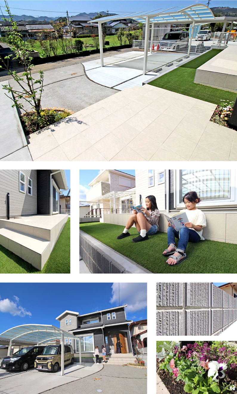 『テラスがほしい』というご要望から始まったプランニング。タイルテラスは部屋からの出入りを重視して、ご希望のサイズでデザインしました。玄関前に同じタイルを使用することで統一感が生まれ、人工芝の艶めく緑が空間を優しく繋ぎます。玄関前に据えた門柱は一服するご主人の“目隠し”として大活躍です。「この雰囲気がいちばん好きです。広いスペースを設けることで玄関先にゆとりが生まれ、家自体に貫禄がついた気がします」と、笑顔の奥様。懸念していた駐車スペースは使い勝手を優先し、玄関へのアクセスの良い階段と緩やかなスロープ、ふたつの動線を確保しました。「解放感があって、緑があって…シンボルツリーの存在感が抜群です。車の乗り降りや玄関への動線など、使い勝手もとても良い。いちばん気に入っているのはスロープです。バイクのために作ったものでしたが、いってきます!と家を飛び出してスロープを駆け下りる元気な子どもたちの姿を見ると、作って良かったな、家を建てて良かったなと思います」と、ご主人も笑顔を浮かべます。緩やかなカーブを描くアプローチにはふたつの星が刻まれました。それは“明るく・楽しく”を願った、奥様のこだわり。「水に浸かったことがとにかくトラウマだったので、同じ経験を繰り返さないよう分からないところには手を差し伸べてもらいながらの外構づくりでした。コスト面でも親身に相談に乗って頂き、信頼できる会社に頼んで良かったです」。ご家族が笑顔で過ごす日常を取り戻した田中様。晴れ渡る空から降りそそぐ陽光が、これからの日々を明るく照らしているかのようでした。