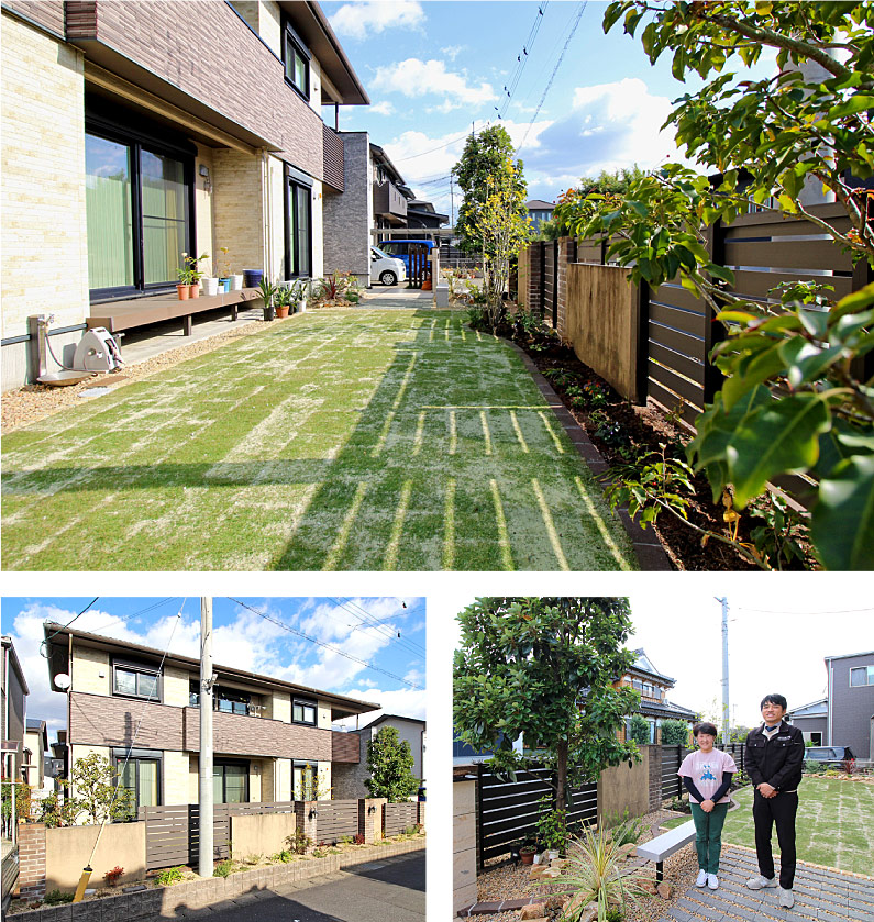 水田様が購入された家の外構とお庭の芝、実は新築当時に弊社が手掛けたものでした。「その事実を知った時、あぁ~やっぱりね!と納得でした。私たちは外構が家づくりのゴールだと思っていたので、この家は最初から完璧だったんです。さすがアウテリアさん、脱帽でした(笑)」。