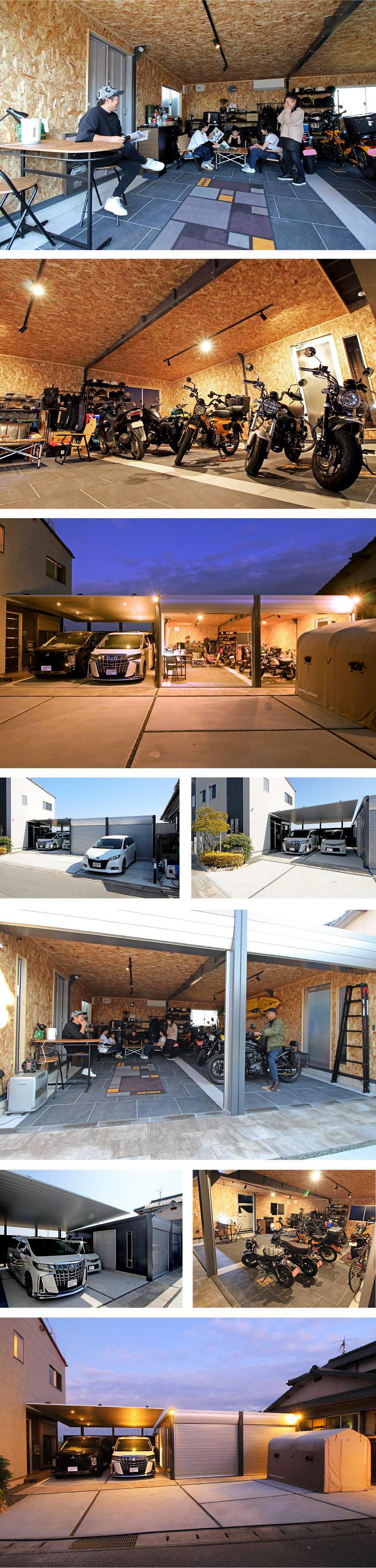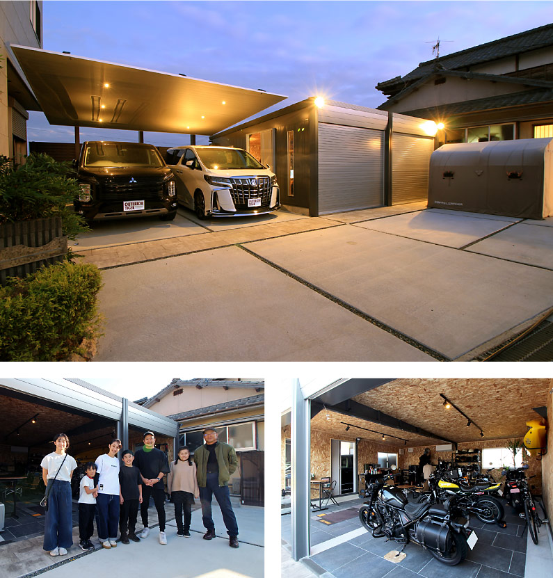 ゆったりと流れるBGMを背景に、淹れたてのコーヒーが鼻をくすぐる穏やかな時間…整然と並ぶバイクは圧巻で、視界に入る全てがご主人の心を満たし、随所に“好き”が溢れています。「最初から内装はこだわろうと思っていました。夏はどうしても暑くなるのでエアコンは必須。そのために下地の補強からお願いして断熱材も入れてもらって、おかげでとても快適です。床も表面の塗装が剥がれないようにタイルできれいに仕上げてもらいました」 。隣接するカーポートは柱が邪魔にならない後方支持タイプで、玄関からガレージまでしっかり空間を覆っています。「駐車スペースに車がギリギリで止まるのでこの形がベスト!ガレージの扉は開き戸だと車に当たってしまうので、特注で引き戸に変えてもらいました。雨の日も濡れることなく、これまでストレスだったハトの被害も無くなって、生活がとても快適になりました」と、少年のように笑うご主人。「工事が始まってからは毎日楽しみで。今日はどこまでできたかな?って、日々進み具合を見ながら完成した空間をイメージしていました。主人は“好き”が多いから、そういうのを全部詰め込んで楽しそうにしている姿を見ると作って良かったなって思います」と、奥様も優しい笑顔を浮かべます。「なかなか休みがとれなくて、最初の数回は親父にあいだに入ってもらって自分たちはイメージ画像を確認しながら話しを進めていきました。担当の方に会ったのはあらかた煮詰まってから。色々わがままを聞いてもらって…工事にもほとんど立ち会えなかったですけど希望通りにピシャリ作って頂きました。以前を思い出せないくらい大きく様変わりして、すごくかっこいい!見た目も機能的にも大満足です」。