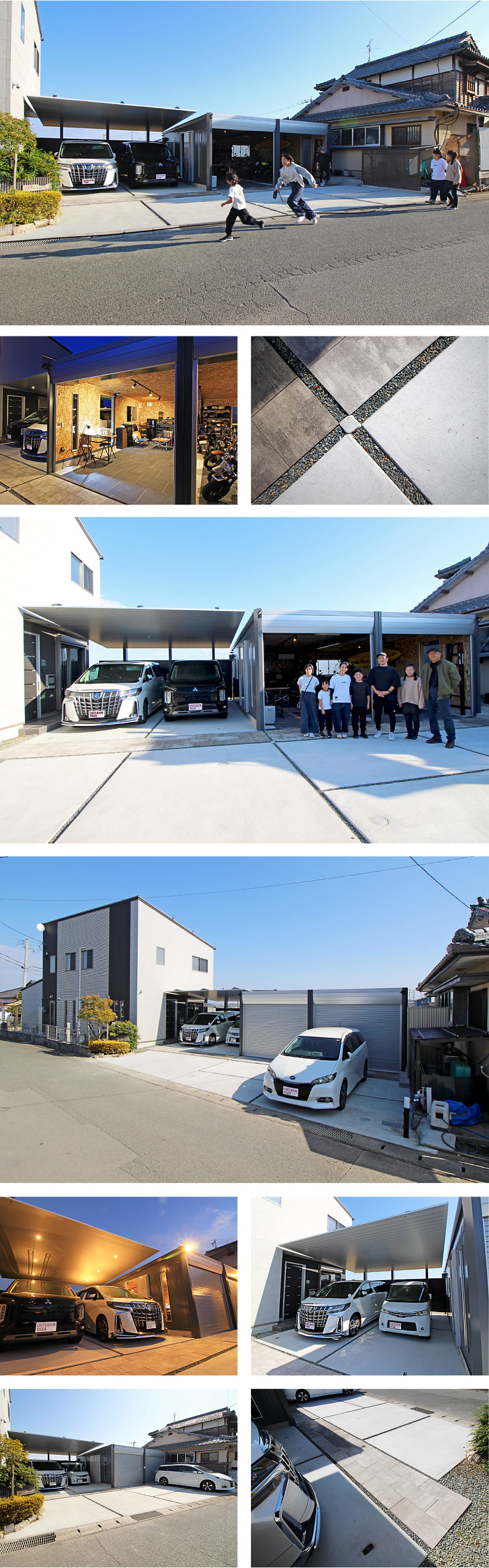 ご実家のお隣りにマイホームを建てられたのは10年前のこと。以来、両家を繋ぐ広い空間は駐車スペースとして、物置として、多目的に活用されてきました。「トラックのコンテナ・プレハブ・ビニールハウス…ここには親父が寄せ集めたいろんなものがありました。それらがどんどん傷みボロボロになってとにかく悲惨な状態。いつか綺麗にしたいと思っていました」。工事の決断を後押ししたのはご主人のバイク愛です。「元々好きで昔から乗ってたんですけど、1年くらい前にバイクへの想いが再燃して(笑)1台また1台と増えていき置く場所が無くなってしまったので、ここにバイクを収納する部屋を作ろうと思いました」。時間を気にせず作業できるように、バイクを最高の状態で保管できるように…選ばれたのはデザイナーズガレージ『アルシア』です。玄関前の雨の降り込みもお悩みだったので、ガレージに合うスタイリッシュな『カーポートSC』も一緒に施工されました。「アウテリアタイガーのことはSNSで知っていましたが、たまたまバイク屋に行く途中に平成店があったのでふらっと寄ってみたのが始まりでした。実際に目にすることで完成のイメージだけじゃなくお金のイメージもできて、しっかり計画することができました」。