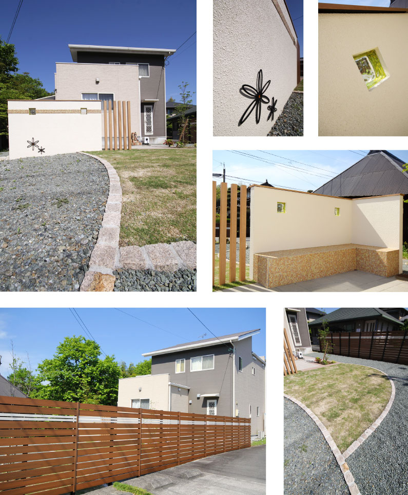 弊社からのご提案に際しては、「できるだけ手入れを簡単にしたい」とのご要望に沿って砂利を入れただけでなく、一部に芝生も張って潤いのある空間を意識。また、目隠しフェンスなどは建物の色合いやテイストに合わせながらも、テラスに設けたデザインウォールには、新たに“可愛らしさ”が感じられるデザインをご提案しました。