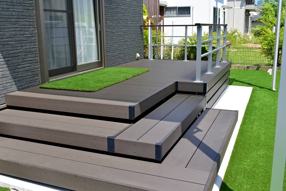 デッキDSの人工木材(木材・プラスチック再生複合材)は100%リサイクル素材の木粉と樹脂でつくられており人にもペットにも安心して使用できるデッキ材です。天然木の質感にこだわってつくられた『DS』は1本1本、床板に濃淡の色ムラを待たせているため、天然素材の外装材や植栽にも調和します。