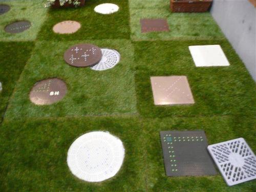 雨水マスのカバーとデザイン倉庫写真です。↑