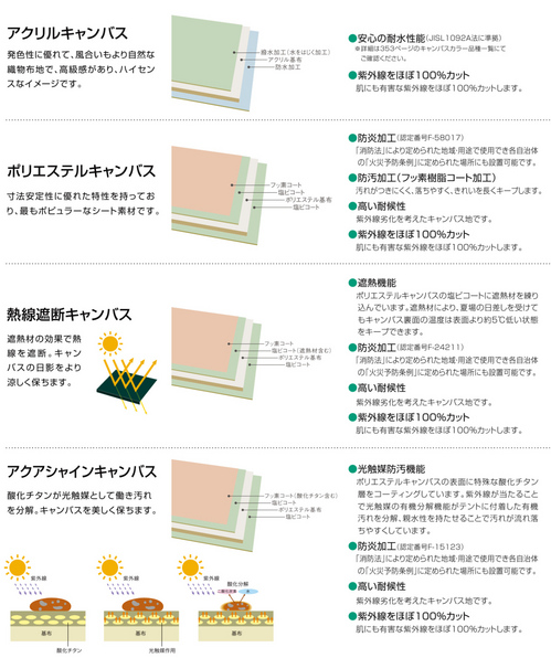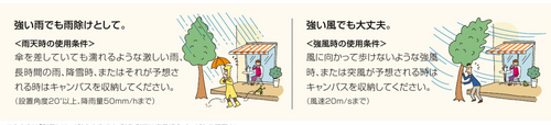 こちらは暑い日の日除けにはもちろん、強度も 風速20m まで対応し雨にも強いので、さまざまな使い方が出来ます。