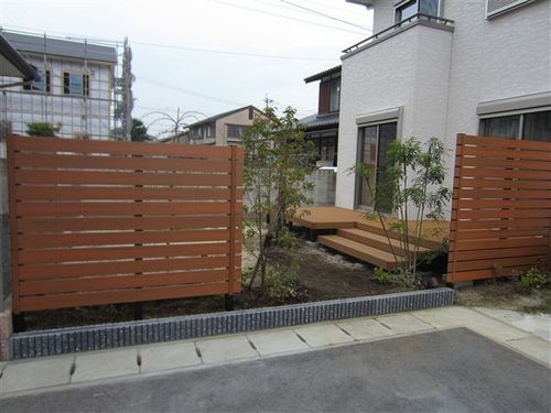 庭部分は、 目隠し として Eウッドスタイル を提案し リビング前に YKK の リウッドデッキ をつけました。そこに,車庫部分にあった植栽を移植して全体的に自然な雰囲気になりました。