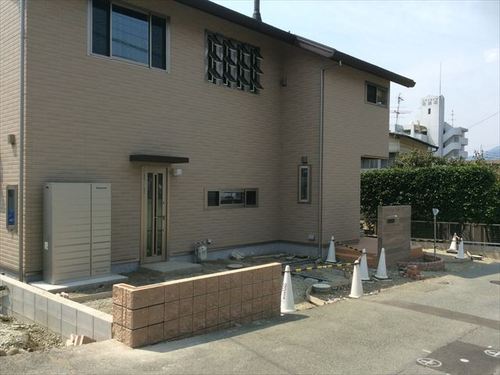 開口を広めにとった車庫と玄関前には、木調タイル仕上の