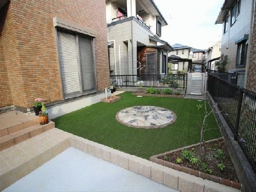 お庭側は防草シートと人工芝(EXALIVE アイターフ)を敷き