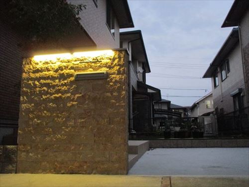↓ 夜になると、 アルミ笠木 に取付たテープライトが、自然石の素材感を