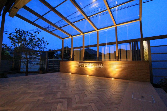 腰壁のライトアップとインゴットの光の融合で、とても幻想的なお庭へを誘います。