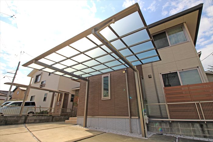 玄関脇にはカーポート『三協アルミ:ニューマイリッシュ』を1台分新設しております。フラット屋根のカーポートは建物や既存の外構に美しくフィットし、スッキリと収まります。