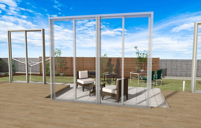 既存のお庭をもっと活用するために、ランドリースペースとして使えるサンルームを取り付けて欲しいというご要望を頂きました。