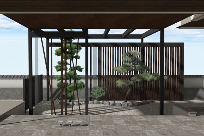 目隠しのデザインは悩みましたが、建物や既存のお庭に調和するデザインをご提案できました。夜の風景も考慮して、ガラス材には照明を配置してライトアップします。