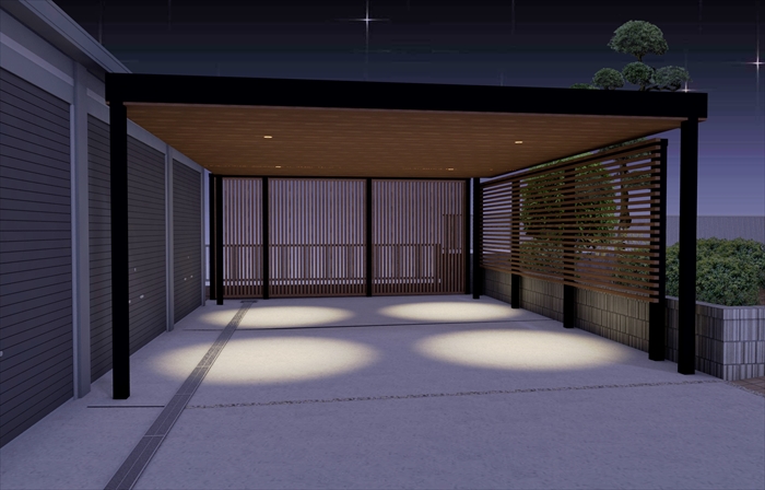 屋根材は、シンプルなフラット屋根のスタンダードタイプと高級感のある天井材付きのプレミアムタイプから選択することができます。柱の位置も移動できる範囲が広いので、ガレージのシャッターや車の動線に邪魔にならない位置に調整することができました。