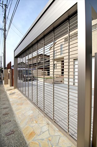 今回は大型門扉やワイドシャッターで道路際をしっかりクローズし、敷地内の解放感を大切にしました。
