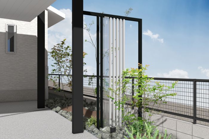 カーポート横には植栽スペースを設け、隣地との境界を優しく仕切ります。デザイン格子でアクセントをつけ外構に奥行感も持たせました。
