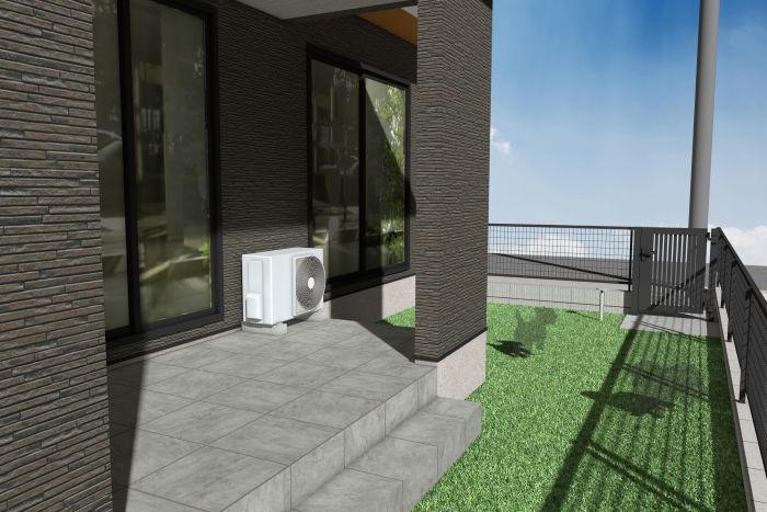 お庭にはハウスメーカー施工でタイルテラスが計画されていたので、そん先には手のかからない人工芝を敷き込みます。フェンスや扉を設置してしっかり囲うので、ワンちゃん達のドッグランとしても活用頂けます。