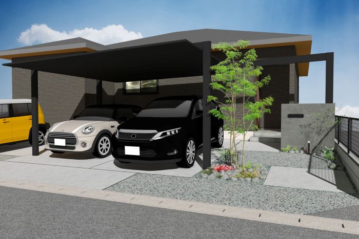 柱・屋根ともにオールブラックでまとめたカーポートが建物外観と調和し、厚みを感じさせないシャープなデザインで広々としたファサード空間を演出します。