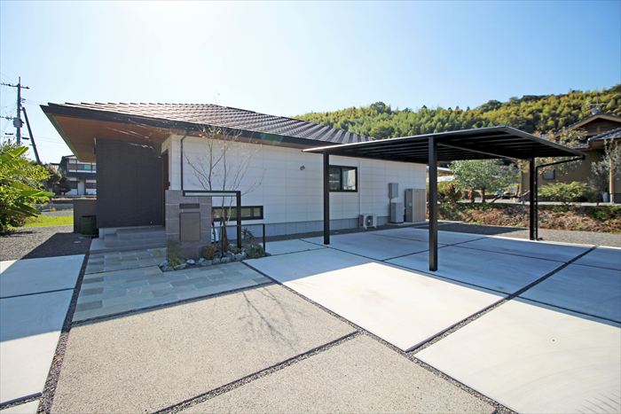 広い車庫スペースはコンクリートで仕上げ、フラット屋根のカーポート『三協アルミ:スカイリード』を設置。黒い佇まいが門廻りと調和し、建物を引き立てます。