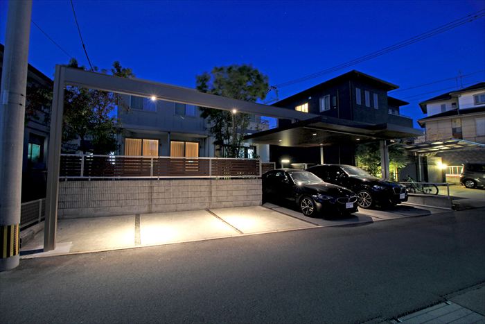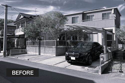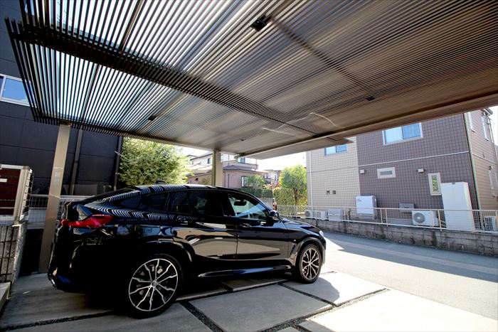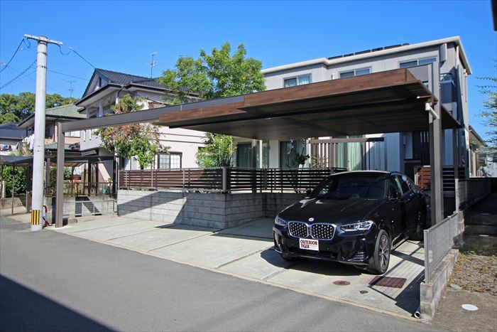 車庫にしっかりと屋根をかけたいとのことで、『三協アルミ: U.スタイル アゼスト セレクトラインタイプ』を選ばれました。外構に調和する木調色。駐車スペースをあますところなく使えるように梁延長の柱を採用し、車の出入りを妨げません。