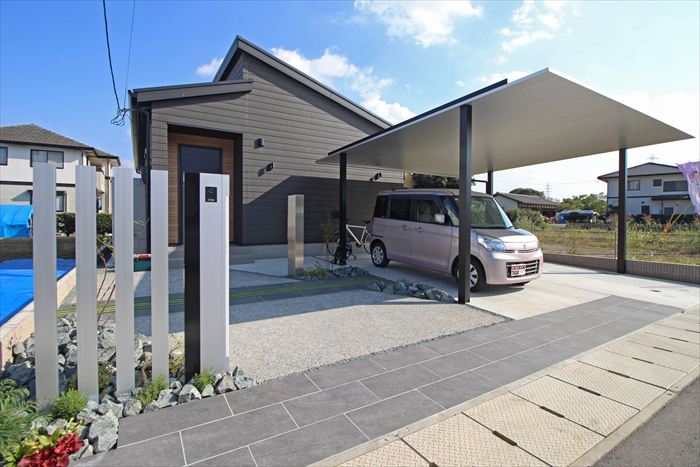 シンプルな佇まいのカーポート『YKKap:プレーンルーフ』に、欲しい機能だけをチョイスできるエントランスユニット『Onlyone:グラティス』を合わせたファサード。