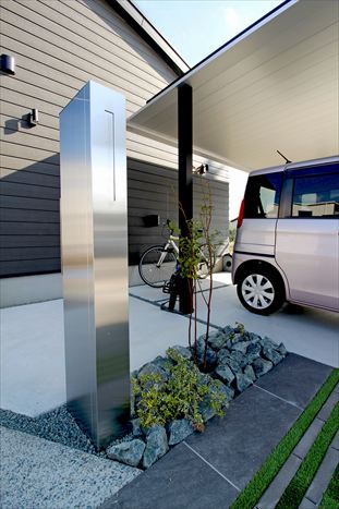 門柱とポストをあえて離して配することで、ファサードに奥行きが生まれました。