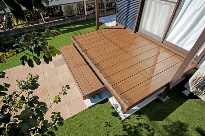 お部屋とお庭をつなぐウッドデッキは『三協アルミ:ヴィラウッド プレミアムライプ』。床板の表面に施された凹凸加工がリアルな木肌感がナチュラル感を高めました。