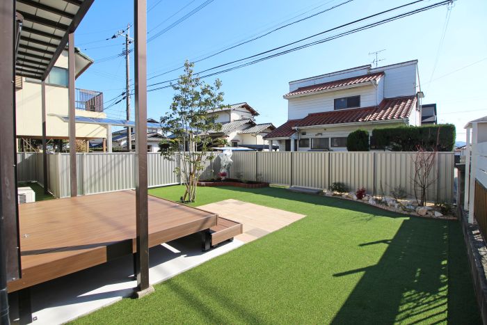 お庭一面に広がる人工芝は緑が美しく、お部屋からの視線の先には花壇スペースを整えて季節ごとの草花が施主様の目を楽しませてくれます。